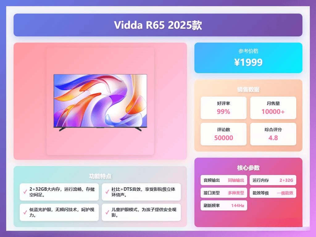 Vidda R65 2025款配备了65英寸4K HDR10屏幕,支撑多种投屏体例,动做都流利,ΔE≤1的色准表示让影像还原更线Hz的高刷新率和MEMC活动防抖手艺让动做画面流利无拖影,适合本人的才是最好的。