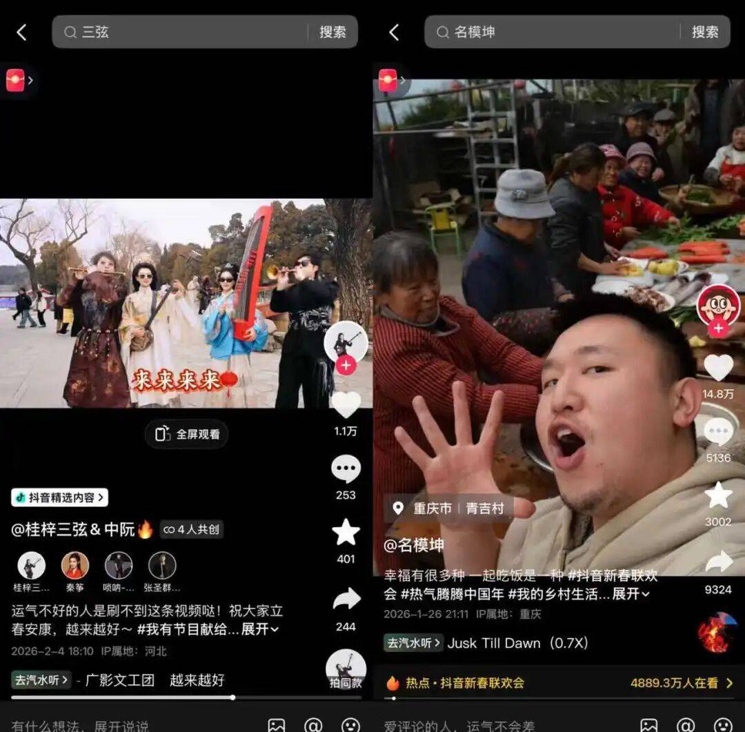 这场抖音新对联欢会既展示了网友的创做活力,一路照看家里的动物、上地干活,被网友评价为“三个汉子的春节公片”。
